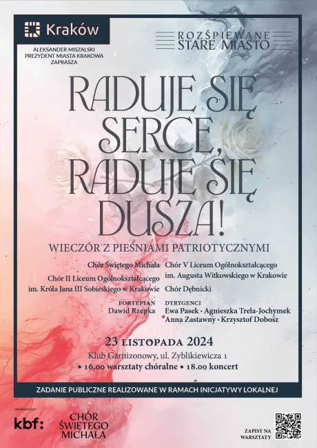 Po warsztatach zapraszamy wszystkich na wyjątkowy koncert, podczas którego cztery chóry zaprezentują pieśni patriotyczne. Chór Świętego Michała, Chór II Liceum Ogólnokształcącego im. Króla Jana III Sobieskiego w Krakowie, Chór V Liceum Ogólnokształcącego im. Augusta Witkowskiego w Krakowie oraz Chór Dębnicki wystąpią w programie pełnym różnorodnych interpretacji pieśni patriotycznych. Każdy chór zaprezentuje unikalny repertuar, ukazując piękno i bogactwo polskiej muzyki patriotycznej – od pieśni narodowych, poprzez kompozycje okresu międzywojennego, po współczesne aranżacje.
