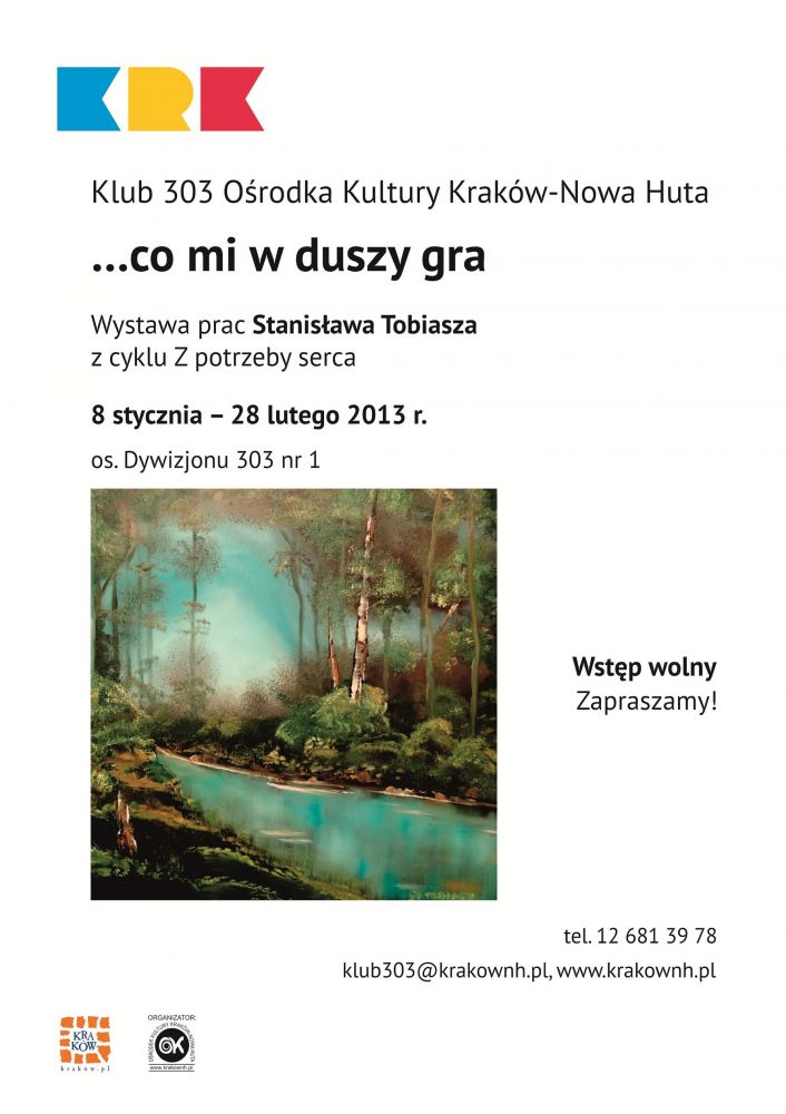 Klub 303 Oœrodka Kultury Kraków-Nowa Huta (os. Dywizjonu 303 nr 1) zaprasza od 8 stycznia do obejrzenia kolejnej wystawy z cyklu Z potrzeby serca. Wystawa, która jest podsumowaniem dorobku artystycznego Stanisława Tobiasza, potrwa do 28 lutego 2013 r.