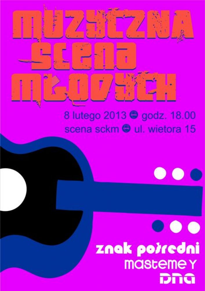 8 lutego 2013 o godz. 18.00 na scenie SCKM ul. Wietora 15 wystpi zespoy dziaajce w Staromiejskim Centrum Kultury Modziey: Znak Poredni, Mastemey i DNA.