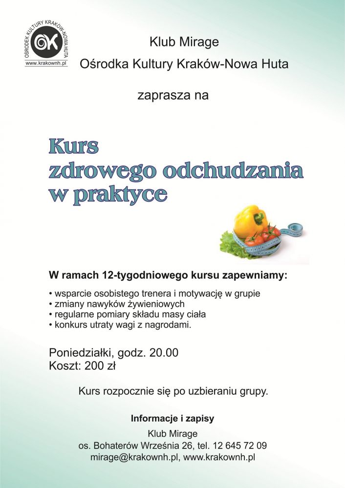 Wszystkie osoby, które chcš zadbać o zdrowie i popracować nad lepszš sylwetkš, zapraszamy na kurs zdrowego odchudzania do Klubu Mirage Oœrodka Kultury Kraków-Nowa Huta (os. Bohaterów Wrzeœnia 26).