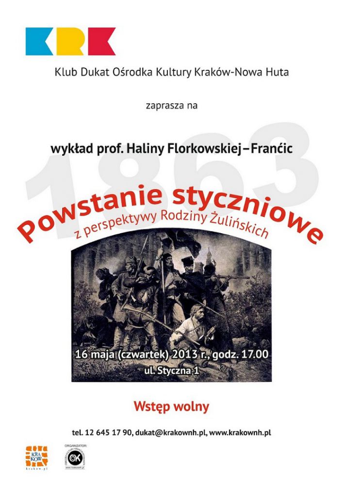 Rodzina Żulińskich to szeœciu braci, którzy walczyli w Powstaniu Styczniowym. Roman Żuliński został stracony wraz z dyktatorem powstania R. Trauguttem. Dwaj bracia zostali zesłani na Sybir a trzej pozostali wyemigrowali do Paryża. Historię tej niezwykłej rodziny przybliży prelekcja prof. dr hab. Haliny Florkowskiej – Franćic z Uniwersytetu Jagiellońskiego, która odbędzie się w Klubie Duklat Oœrodka Kultury Kraków-Nowa Huta.