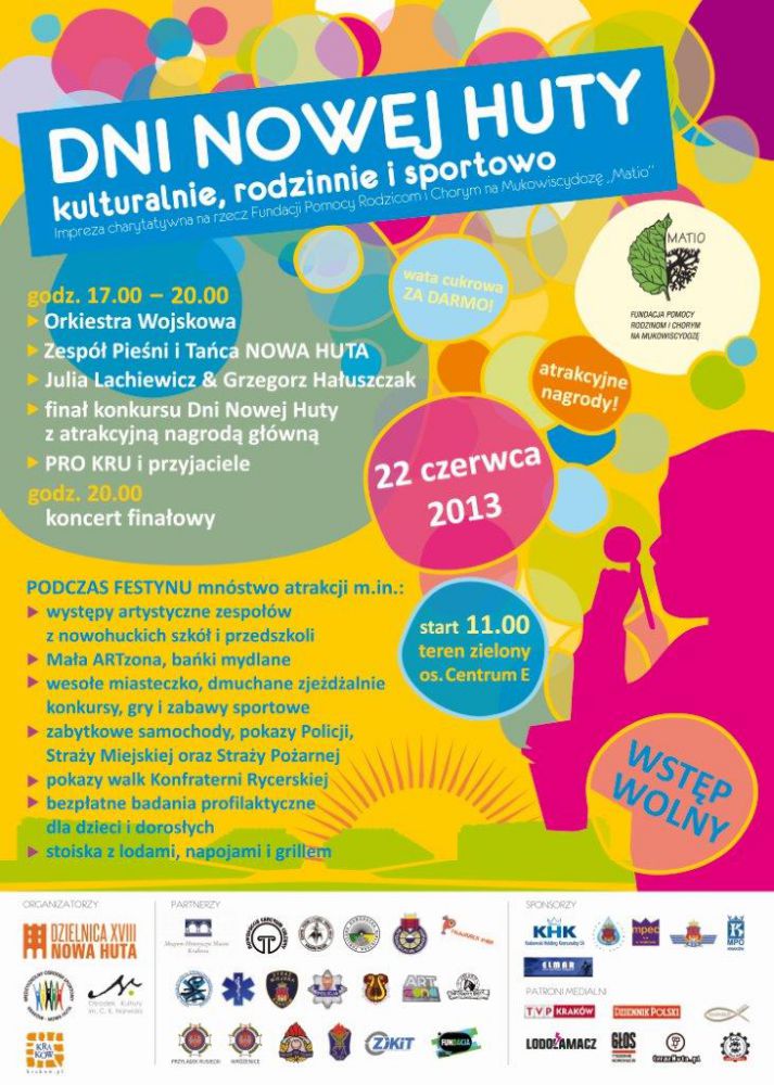 Zapraszamy na DNI NOWEJ HUTY – rodzinnš, sšsiedzkš i wielopokoleniowš imprezę plenerowš, która odbędzie się w sobotę 22 czerwca na terenie zielonym pomiędzy NCK a Centrum E. Impreza rozpocznie się o godzinie 11.00 a zakończy koncertem zespołu muzycznego około godziny 21.30.