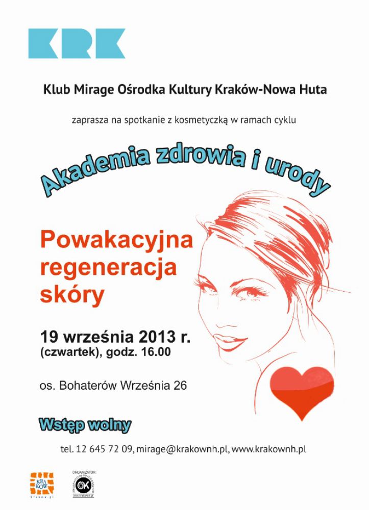 Klub Mirage Oœrodka Kultury Kraków-Nowa Huta (os. Bohaterów Wrzeœnia 26) zaprasza panie na kolejne spotkanie z konsultantkami kosmetycznymi w ramach cyklu Akademia Zdrowia i Urody, które odbędzie się 19 wrzeœnia o godz. 16.00