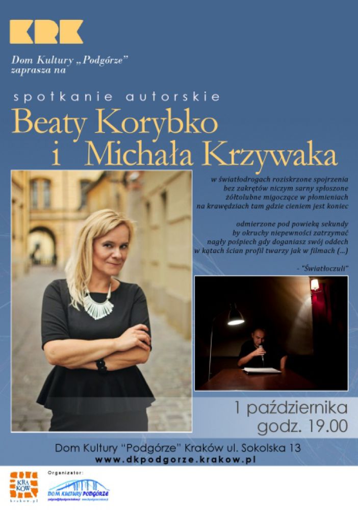 We wtorek 1 paŸdziernika w DK Podgrórze odbędzie się spotkanie autorskie dwójki krakowskich poetów : Beaty Korybko i Michała Krzywaka. Spotkanie będzie stanowić rozważanie i być może odpowiedŸ na pytanie czy poezja jest uniwersalna w swym przekazie, ile jest w niej z teatru oraz jak może poprowadzić dialog pomiędzy różnymi poetykami.