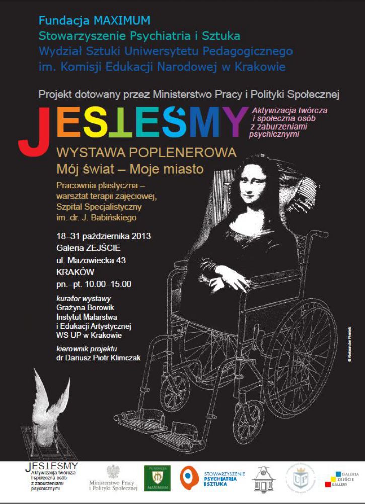 O projekcie: Fundacja „Maximum” jako organizacja pozarzšdowa w kooperacji ze Stowarzyszeniem „Psychiatria i Sztuka” oraz innymi partnerami realizuje, dzięki wsparciu Ministerstwa Pracy i Polityki Społecznej oraz œrodków własnych, projekt „JESTEŒMY”. Aktywizacja twórcza i społeczna osób z zaburzeniami psychicznymi przy aktywnym zaangażowaniu beneficjentów ostatecznych (osób dorosłych i młodzieży przewlekle chorujšcych psychicznie, z zaburzeniami depresyjnymi itp.). Projekt opiera na następujšcych działaniach: