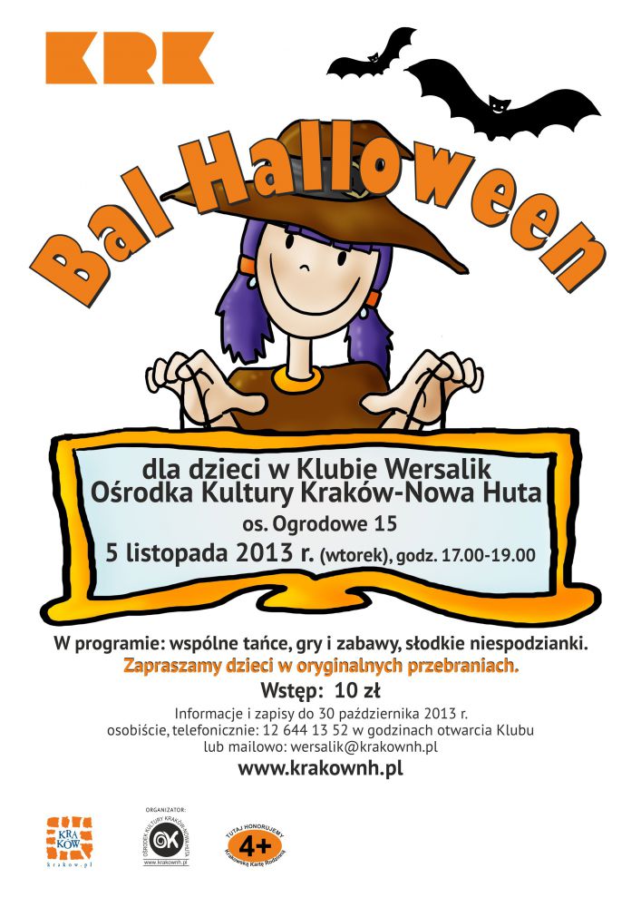 Klub Wersalik Orodka Kultury Kraków-Nowa Huta (os. Ogrodowe 15) zaprasza dzieci 5 listopada w godz. 17.00-19.00 na halloweenowy bal.