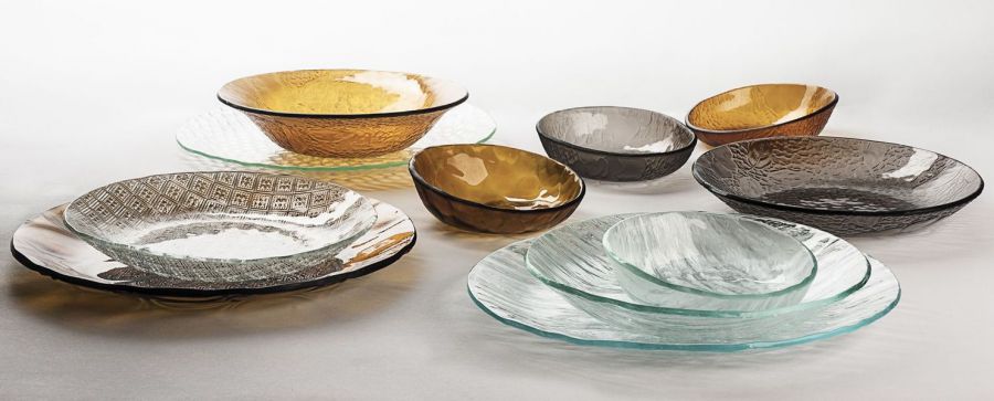 Cechš charakterystycznš twórczoœci Katarzyny Harasym jest jej ogromna różnorodnoœć. Różnorodnoœć stosowanych technik (fusing, slumping, palniki, pâte de verre), różnorodnoœć form wyrazu (instalacje, rzeŸby, naczynia codziennego użytku, biżuteria). I niczym nieskrępowana wyobraŸnia. To właœnie ona podsunęła Artystce pomysł, by wykorzystać stare, popeerelowskie szyby drzwiowe do stworzenia serii nowoczesnych naczyń szklanych.