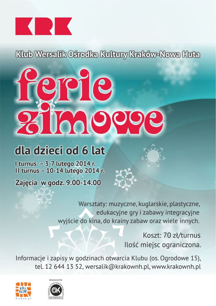 Co zrobić w sytuacji, gdy zima nie mamy na ferie możliwoœci wyjazdu poza miasto i trzeba spędzić ten czas w mieœcie? Zapraszamy dzieci na zajęcia do Klubu Wersalik Oœrodka Kultury Kraków-Nowa Huta (os. Ogrodowe 15).