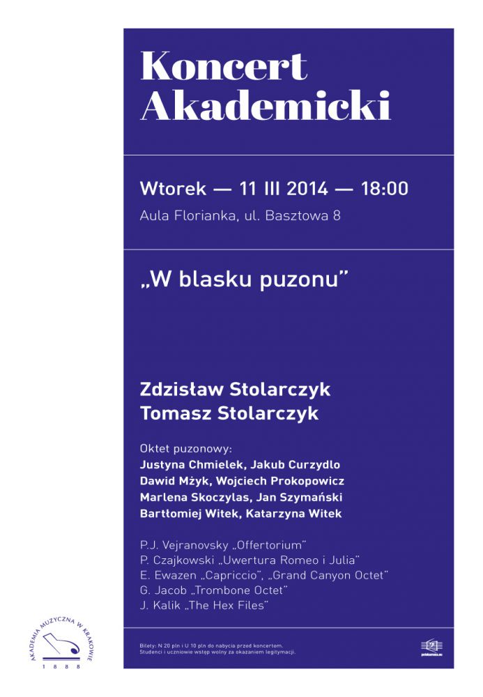 Jego motywem przewodnim będzie puzon. Na scenie ujrzymy oktet puzonowy, w którego skład wchodzš studenci Akademii Muzycznej w Krakowie. Młodzi adepci gry na tym instrumencie wystšpiš wraz ze swoimi znakomitymi pedagogami: Zdzisławem i Tomaszem Stolarczykami, którzy oprócz działalnoci dydaktycznej współpracujš m.in. z zespołem Golec uOrkiestra. W repertuarze koncertu znajdujš się zarówno transkrypcje utworów muzyki klasycznej, jak również kompozycje stworzone na takš obsadę.