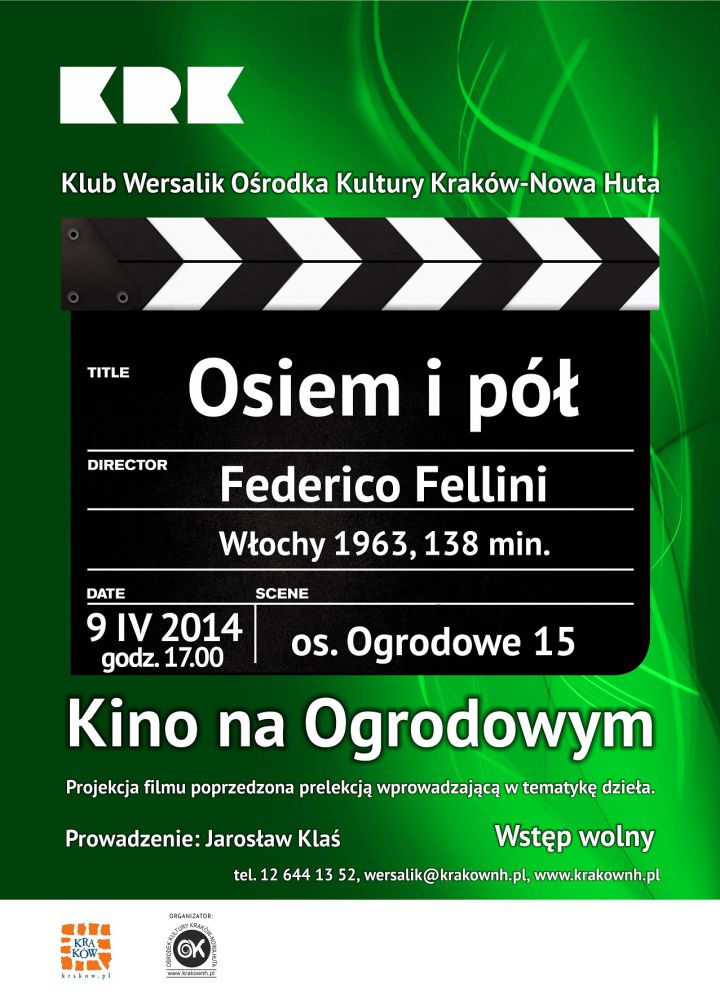 Tym razem będzie można obejrzeć obraz Federico Felliniego Osiem i pół. Projekcję poprzedzi prelekcja Jarosława Klasia – kulturoznawcy, doktoranta Wydziału Zarzšdzania i Komunikacji Społecznej UJ. Omówione zostanš charakterystyczne cechy twórczoœci F. Felliniego oraz kontekst powstania filmu. Zachęcamy również do wspólnej dyskusji i analizy filmu.