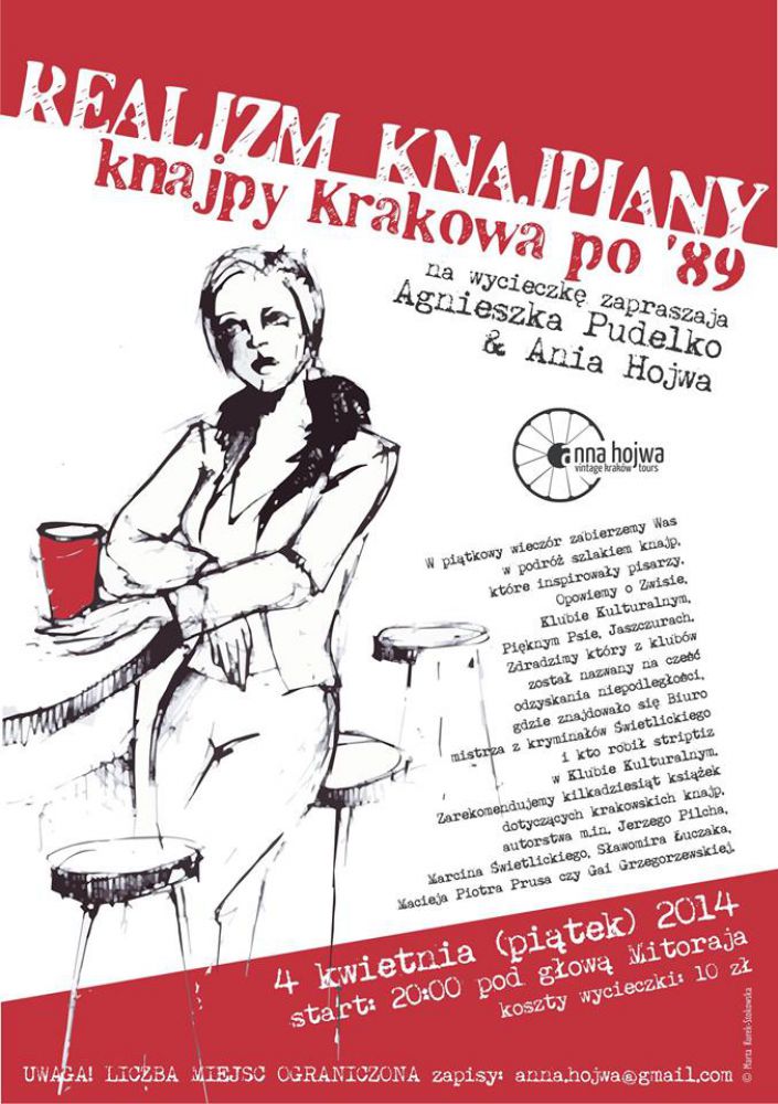 W pištkowy wieczór zabierzemy was w podróż szlakiem knajp, które zainspirowały największš iloć pisarzy. Opowiemy o Zwisie, Klubie Kulturalnym, Pięknym Psie, Jaszczurach. Zdradzimy który z klubów został nazwany na czeć odzyskania niepodległoci, gdzie znajdowało się Biuro mistrza z kryminałów wietlickiego i kto robił striptiz w Klubie Kulturalnym. Zarekomendujemy kilkadziesišt ksišżek dotyczšcych krakowskich knajp, autorstwa m.in. Jerzego Pilcha, Marcina wietlickiego, Sławomira Łuczaka, Macieja Piotra Prusa czy Gai Grzegorzewskiej.