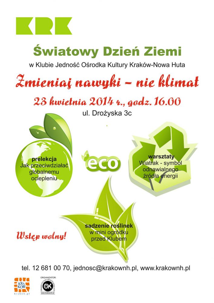 Zmieniaj nawyki, nie klimat - pod takim hasłem odbędzie się impreza z okazji największego ekologicznego więta wiata, które obchodzone jest w 192 krajach. Klub Jednoć Orodka Kultury Kraków-Nowa Huta (ul. Drożyska 3 c) jak co roku włšcza się w obchody Dnia Ziemi poprzez organizację warsztatów, na których z materiałów wtórnych i naturalnych wykonywany będzie wiatrak odnawialne ródło energii. Nie zabraknie również krótkiej prelekcji na temat zmian klimatu i przeciwdziałania globalnemu ociepleniu, a przed Klubem powstanie mini ogródek, gdzie przybyli na imprezę posadzš różne roliny.