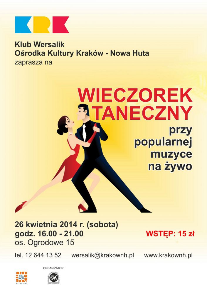 Po œwištecznej przerwie wracajš taneczne zabawy dla dorosłych w Klubie Wersalik Oœrodka Kultury Kraków-Nowa Huta (os. Ogrodowe 15). Zapraszamy już 26 kwietnia, w godz. 16.00-21.00. Do tańca przygrywać będzie zespół Mariana Soi. Propozycja dla osób, które sobotni wieczór chcš spędzić bawišc się na parkiecie. Iloœć miejsc ograniczona. Informacje i zapisy w Klubie (tel. 12 644 13 52, wersalik@krakownh.pl).