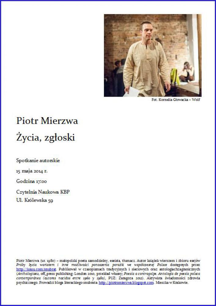 Piotr Mierzwa (ur. 1980) – małopolski poeta niezależny, eseista, tłumacz. Autor ksišżek wierszem i zbioru esejów Próby bycia wariatem i inne możliwoœci ponoszenia porażki we współczesnej Polsce dostępnych przez http://issuu.com/snubrat. Publikował w czasopismach tradycyjnych i sieciowych oraz antologiach zagranicznych (Anthologia#2, off_press publishing: London 2010, przekład własny; Poesía a contragolpe. Antología de poesía polaca contemporánea (autores nacidos entre 1960 y 1980), PUZ: Zaragoza 2012). Aktywista œwiadomoœci zdrowia psychicznego. Prowadzi bloga literackiego snubrata: http://piotrsmierzwa.blogspot.com. Mieszka w Krakowie.