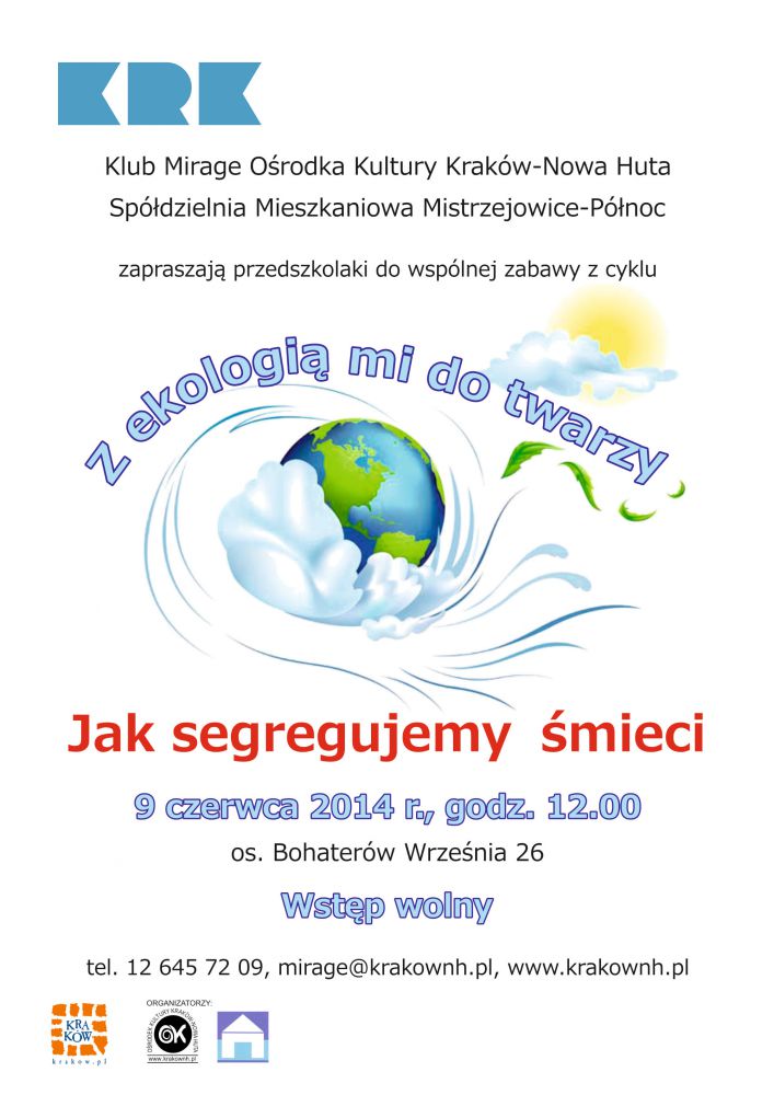 Klub Mirage Oœrodka Kultury Kraków-Nowa Huta (os. Bohaterów Wrzeœnia 26) zaprasza 9 czerwca o godz. 12.00 na zajęcia edukacyjne dla dzieci w wieku przedszkolnym w ramach cyklu Z ekologiš mi do twarzy. Podczas zajęć maluchy dowiedzš się na czym polega recycling, jak segregować odpady do odpowiednich pojemników oraz jakie znaczenia dla œrodowiska ma proces przetwarzania œmieci. Współorganizatorem spotkania jest Spółdzielnia Mieszkaniowa Mistrzejowice Północ.
