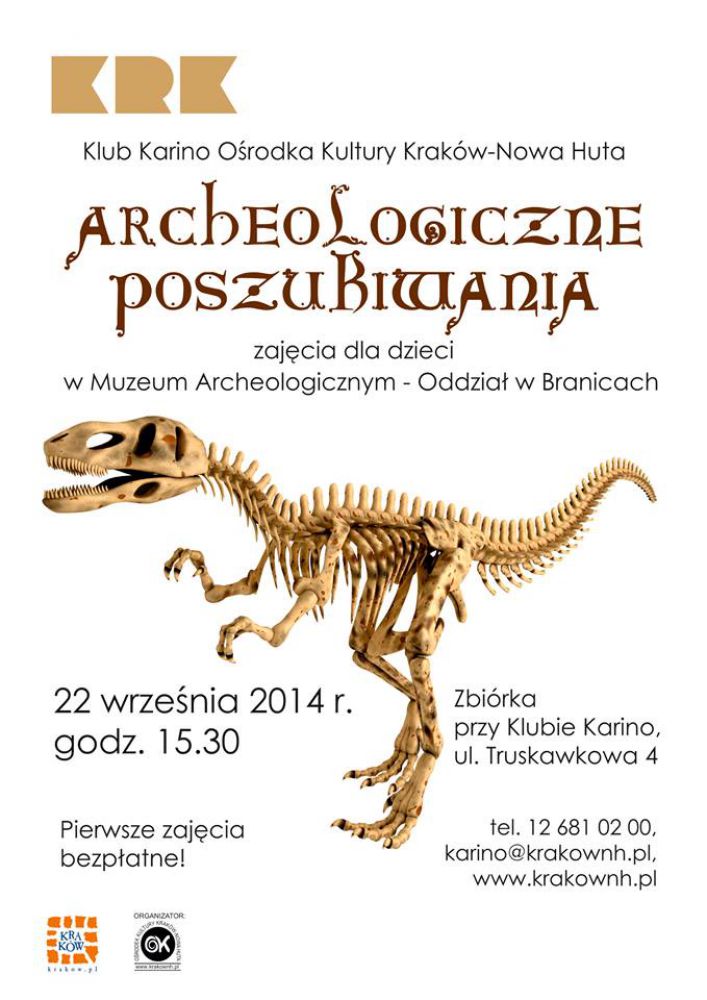 Klub Karino Orodka Kultury Kraków-Nowa Huta (ul. Truskawkowa 4) zaprasza 22 wrzenia 2014 r. o godz. 15.30 na pierwsze, pokazowe zajęcia w ramach Klubu Młodego Archeologa w nowym roku kulturalno-owiatowym dla dzieci w wieku przedszkolnym i wczesnoszkolnym.