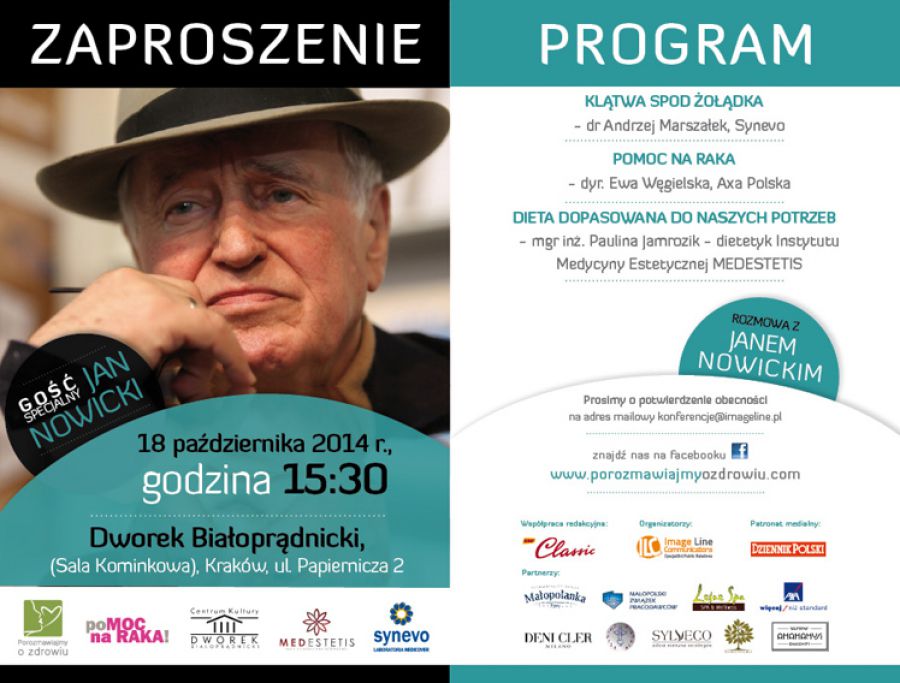 Serdecznie zapraszamy po wakacyjnej przerwie na spotkanie z cyklu „Porozmawiajmy o zdrowiu”, które odbędzie się w najbliższš sobotę, 18.10.2014 r., w Dworku Białopršdnickim w Krakowie. Goœciem specjalnym będzie Jan Nowicki. Będziemy rozmawiać nie tylko o zdrowiu.
