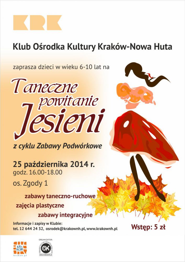 Klub Oœrodka Kultury Kraków-Nowa Huta (os. Zgody 1) zaprasza dzieci w wieku od 6 do 10 lat na spotkanie Taneczne powitanie jesieni z cyklu Zabawy podwórkowe.