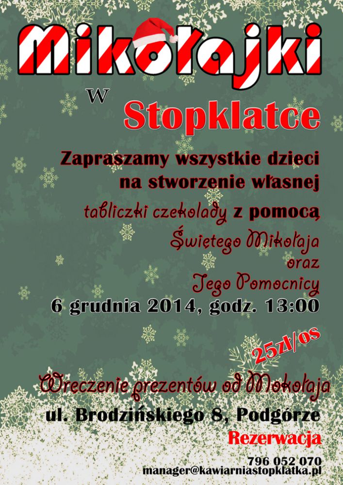 Drogie Dzieci! Kawiarnia Stopklatka zaprasza Was na niezwykłe warsztaty, na których pod czujnym okiem więtego Mikołaja i jego pomocnicy przygotujecie niepowtarzalny upominek dla swoich bliskich (albo dla siebie)w postaci autorskiej czekolady!