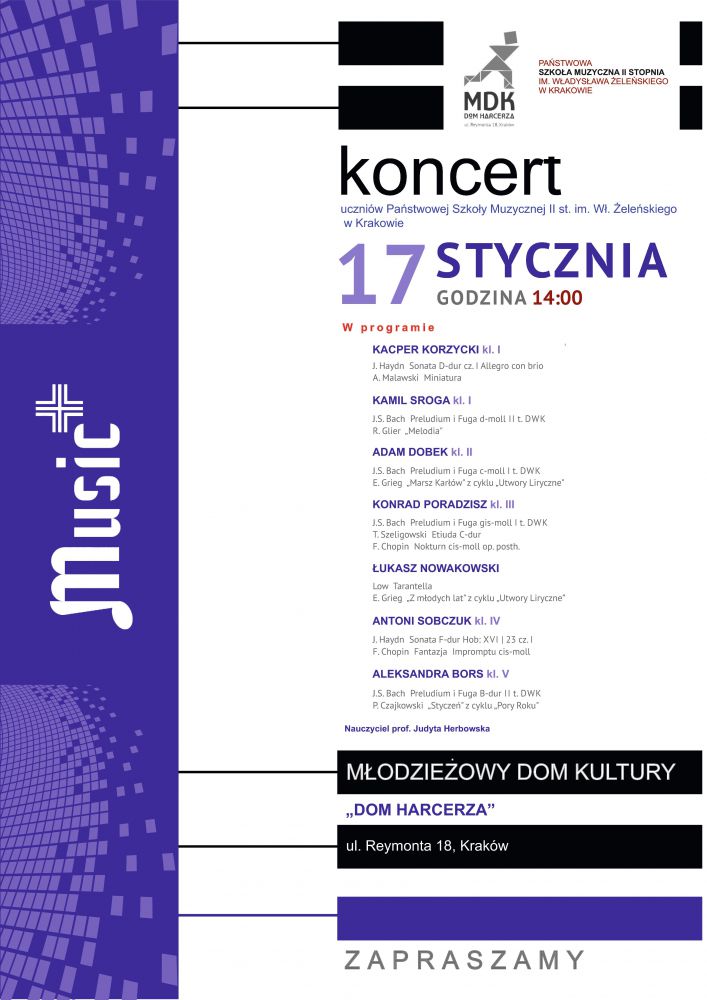 Serdecznie zapraszamy na Koncert w wykonaniu uczniów Państwowej Szkoły Muzycznej II st. im. Wł. Żeleńskiego w Krakowie. Koncert odbędzie się 17 stycznia godz. 14.00. Miejsce: sala widowiskowa MDK „Dom Harcerza” ul. Reymonta 18.