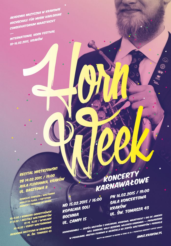 W dniach 10-16 lutego 2015 r. Akademia Muzyczna w Krakowie zaprasza na Międzynarodowy Festiwal Waltorniowy HornWeek Kraków 2015. Cieszšcy się wiatowš renomš International Horn Festival HornWeek jest festiwalem organizowanym corocznie od 2004 roku w Niemczech i Holandii, za w lutym dołšczy do niego klasa waltorni Akademii Muzycznej w Krakowie. Czynny udział w projekcie HornWeek wemie 41 młodych waltornistów studentów z Akademii Muzycznych w Krakowie, Karlsruhe, Maastricht i Rio de Janeiro.