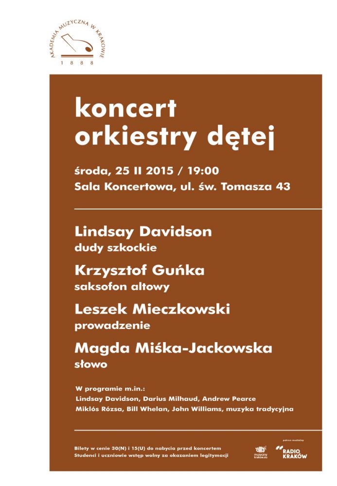Akademia Muzyczna w Krakowie zaprasza na Koncert Orkiestry Dętej, który odbędzie się w rodę 25 lutego o godzinie 19:00 w Sali koncertowej przy ul. w. Tomasza 43. W programie zabrzmiš m.in. irlandzkie melodie ludowe wykonywane na dudach szkockich. Solistami koncertu będš Lindsay Davidson (dudy) oraz Krzysztof Guńka (saksofon altowy). Za pulpitem dyrygenckim stanie Leszek Mieczkowski, a wieczór poprowadzi Magda Mika-Jackowska. Bilety w cenie 30N i 15U zł do nabycia przed koncertem. Studenci i uczniowie wstęp wolny za okazaniem legitymacji.