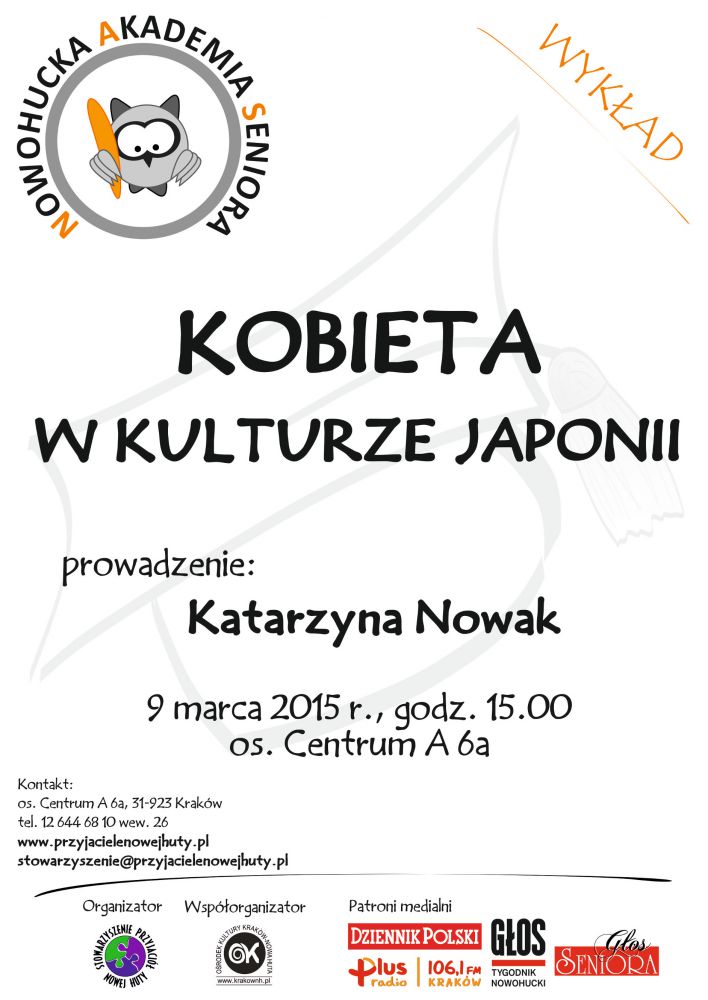 Kolejny wykład w ramach Nowohuckiej Akademii Seniora poprowadzi Katarzyna Nowak, wicedyrektor Muzeum Sztuki i Techniki Japońskiej Manggha. Wychodzšc od obrazu kobiety w mitologii japońskiej prowadzšca przedstawi jak kształtowały się model rodziny oraz rola kobiet w kulturze japońskiej na przestrzeni epok. Nie zabraknie także opowieci o tym z jakimi wyzwaniami musi zmierzyć się współczesna Japonka.