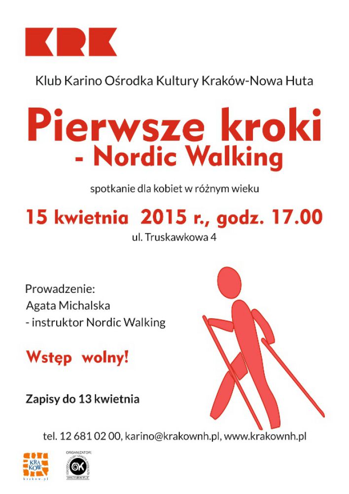 Rusza nowo powstała sekcja Nordic Walking dla pań w Klubie Karino Oœrodka Kultury Kraków-Nowa Huta (ul. Truskawkowa 4). Pierwsze spotkanie z trenerem tej dyscypliny sportowej, który nauczy prawidłowej techniki marszu i pomoże dobrać odpowiednie kije odbędzie się 15 kwietnia o godz. 17.00. Nordic Walking to forma rekreacji dla każdego bez względu na wiek, polegajšca na marszach ze specjalnymi kijami. Korzyœci sš ogromne dla zdrowia jak i lepszego samopoczucia.