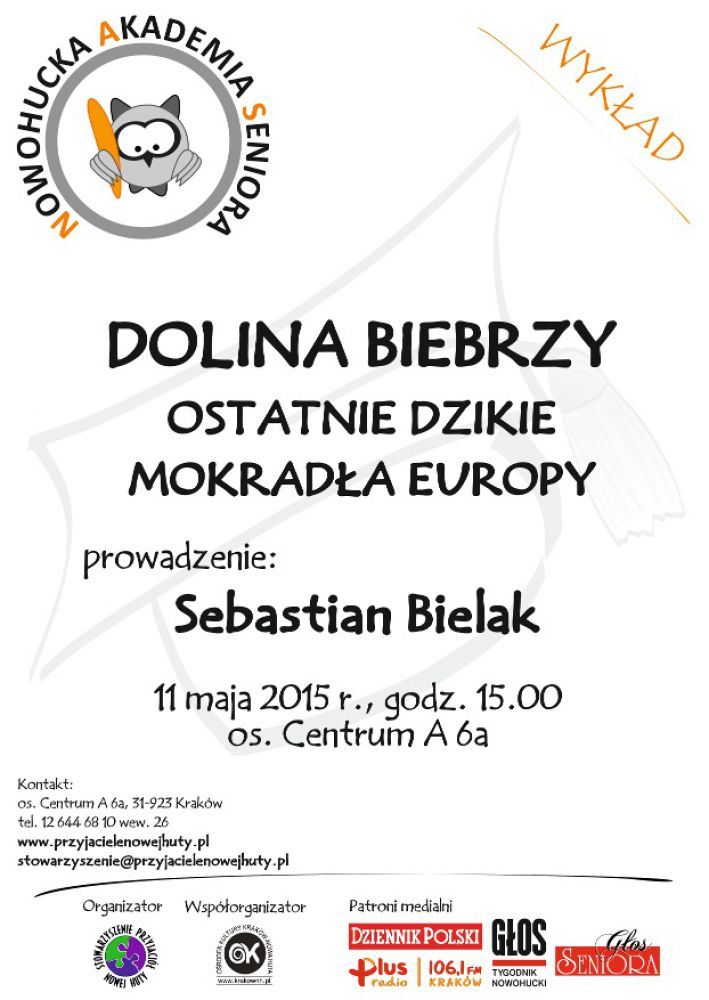 Zapraszamy 11 maja o godz. 15.00 na kolejny wykład dla Nowohuckiej Akademii Seniora (os. Centrum A 6a), który wygłosi Sebastian Bielak – absolwent Akademii Górniczo-Hutniczej oraz Politechniki Krakowskiej, pracownik naukowo–dydaktyczny Instytutu Inżynierii i Gospodarki Wodnej PK, z zamiłowania przyrodnik i podróżnik. Słuchacze będš mieli możliwoœć zobaczyć fotografie i usłyszeć opowieœci z jego podróży po Dolinie Biebrzy.