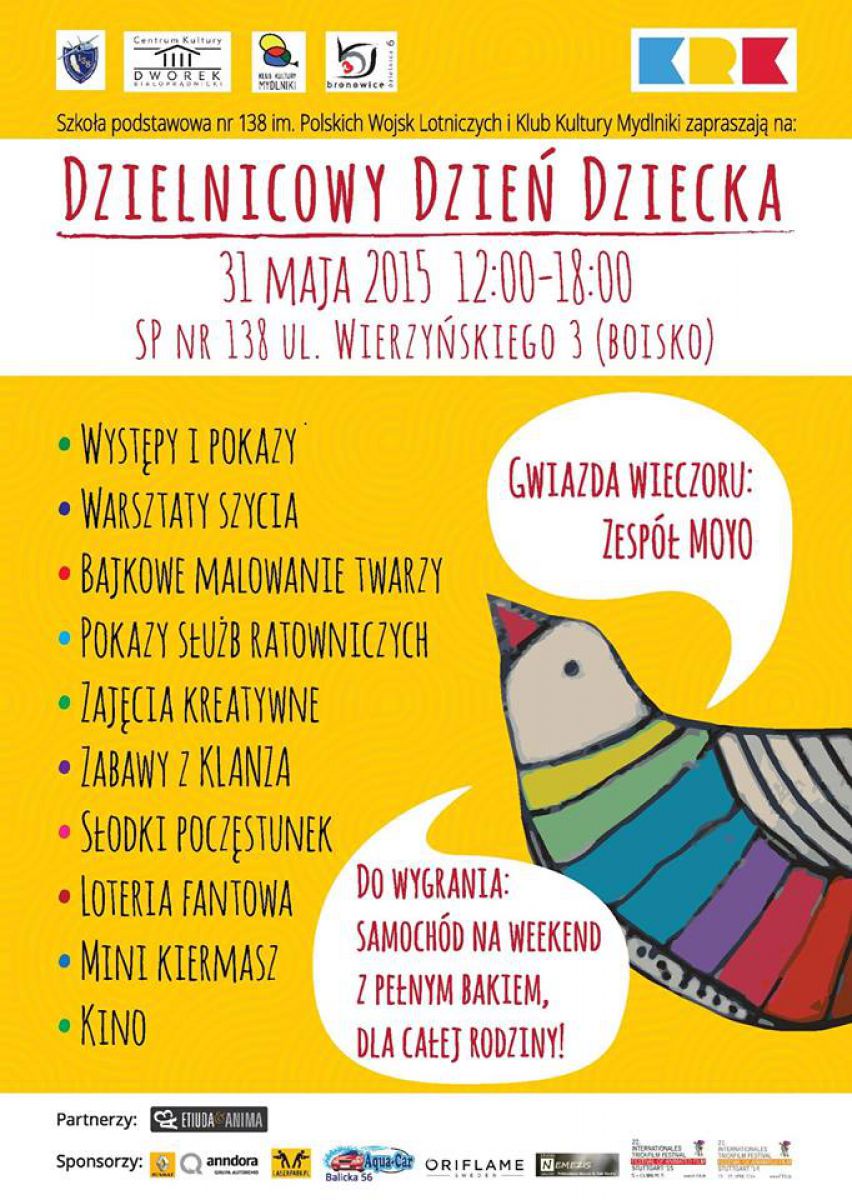 Serdecznie zapraszamy całe rodziny na Dzielnicowy Dzień Dziecka w Mydlnikach, który odbędzie się 31 maja 2015 na boisku Szkoły Podstawowej nr 138 (ul. K. Wierzyńskiego 3), w godzinach 12:00 - 18:00. Organizacji festynu podjęli się nauczyciele i rodzice uczniów ze Szkoły Podstawowej 138 oraz instruktorzy z Klubu Kultury Mydlniki.