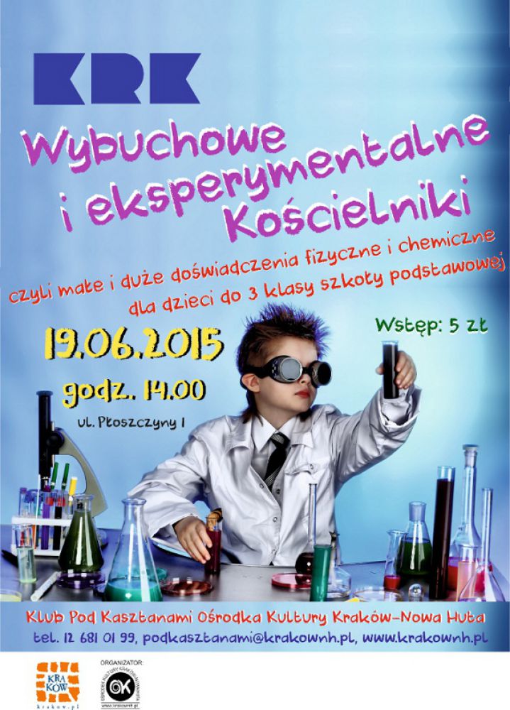 Klub Pod Kasztanami Oœrodka Kultury Kraków-Nowa Huta (ul. Płoszczyny 1) zaprasza dzieci na zajęcia eksperymentalne, które odpowiedzš na wiele pytań dotyczšcych zjawisk zachodzšcych w otaczajšcym nas œwiecie. Odbędš się one 19 czerwca br. o godz. 14.00. Dzieci poprzez konkretne eksperymenty i działania poznajš właœciwoœci wody, powietrza i innych gazów, a także zobaczš reakcja utleniania i redukcji, nauczš się rozpoznawać kwasy, zasady i kryształy.