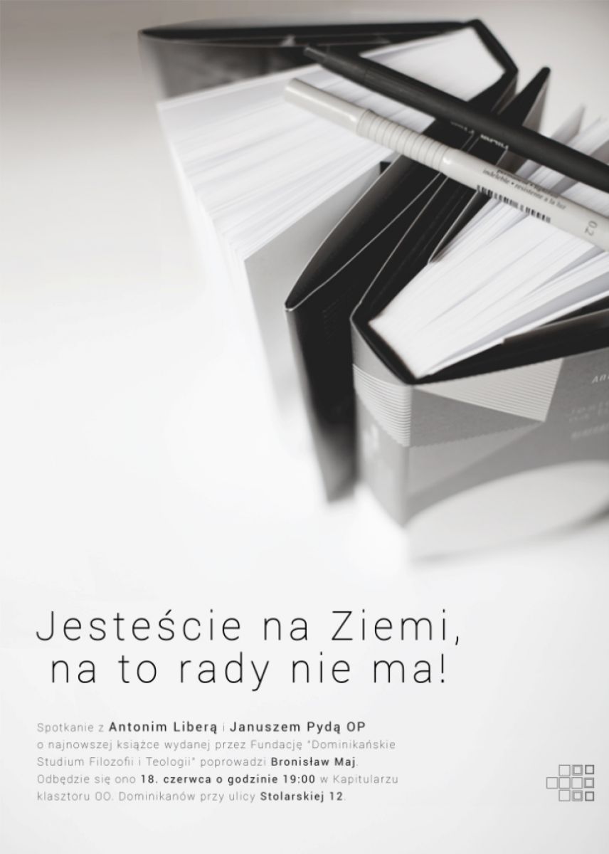 Spotkanie z Antonim Liberš i o. Januszem Pydš OP - autorami ksišżki "Jesteœcie na Ziemi, na to rady nie ma!". Dwanaœcie dialogów wokół dwunastu dramatów Samuela Becketta powstało w następstwie seminarium poœwięconego twórczoœci irlandzkiego noblisty, jakie w roku 2012-2013 prowadziła „Szkoła Czytania”, działajšca w ramach Fundacji „Dominikańskie Studium Filozofii i Teologii”.