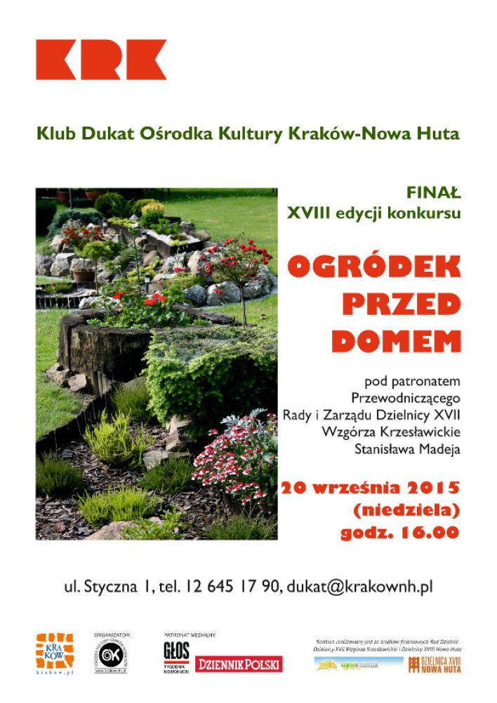 Klub Dukat Oœrodka Kultury Kraków-Nowa Huta (ul. Styczna 1) zaprasza 20 wrzeœnia o godz. 16.00 na Finał konkursu Ogródek przed Domem. Podczas imprezy finałowej nastšpi odczytanie werdyktu Jury i wręczenie nagród. Spotkaniu towarzyszyć będzie wernisaż pokonkursowej wystawy fotograficznej. Na wszystkich uczestników czeka specjalnie przygotowany poczęstunek w ogrodzie Klubu Dukat.