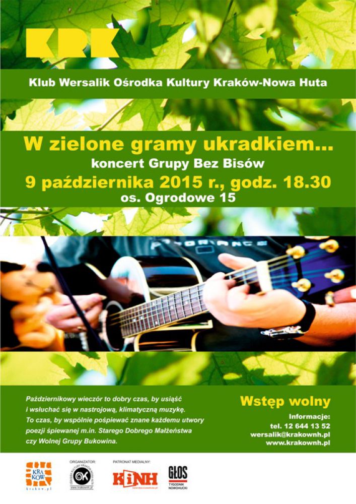 Wszystkich wielbicieli Krainy Łagodnoœci Klub Wersalik Oœrodka Kultury Kraków-Nowa Huta (os. Ogrodowe 15) zaprasza na występ Grupy Bez Bisów. PaŸdziernikowy wieczór to dobry czas, by usišœć i wsłuchać się w nastrojowš, klimatycznš muzykę. To czas, by wspólnie poœpiewać znane każdemu utwory poezji œpiewanej m.in. Starego Dobrego Małżeństwa czy Wolnej Grupy Bukowina. To również dobra okazja, by wyjœć z domu i spotkać się z osobami, którym bliskie sš te klimaty muzyczne. Zapraszamy 9 paŸdziernika o godz. 18.30.