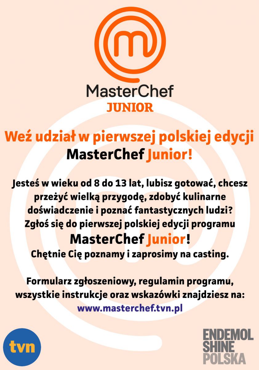 Jeli twoje dziecko w kuchni czuje się jak ryba w wodzie, uwielbia gotować i wcišż zaskakuje Cię nowymi pysznymi potrawami, ten program jest włanie dla niego! Już w listopadzie rozpoczynajš się poszukiwania pierwszego polskiego MasterChefa Juniora!
