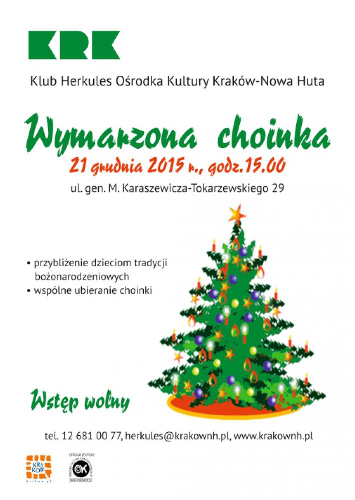 Wymarzona choinka to spotkanie przedœwišteczne dla dzieci w Klubie Herkules Oœrodka Kultury Kraków-Nowa Huta (os. Branice, ul. gen. M. Karaszewicza-Tokarzewskiego 29), którego celem jest przybliżenie dzieciom tradycji i obrzędów, zwišzanych z ubieraniem choinki i œwiętami Bożego Narodzenia. Podczas spotkania dzieci ubiorš choinkę własnoręcznie wykonanymi ozdobami z bibuły, kolorowych papierów, piórek, wydmuszek, słomy. Nie zabraknie także dzielenia się opłatkiem i wspólnego kolędowania. Zapraszamy 21 grudnia na godz. 15.00.