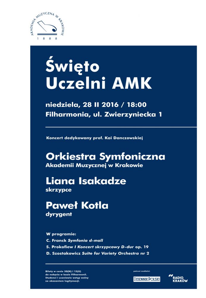Orkiestrę Symfoniczna Akademii Muzycznej, w której oprócz studentów zasišdš również profesorowie uczelni, poprowadzi znakomity dyrygent Paweł Kotla. Solistkš koncertu będzie skrzypaczka, Liana Isakadze. W programie znajdzie się wielka symfonika europejska w postaci dzieł Cesara Francka, Sergiusza Prokofiewa i Dymitra Szostakowicza. Będzie to niewštpliwie Muzyczne œwięto Krakowa, zważywszy na okolicznoœci koncertu, jego program oraz całš plejadę wybitnych krakowskich instrumentalistów, którzy wraz z muzyczna młodzieżš zasišdš przy orkiestrowych pulpitach.