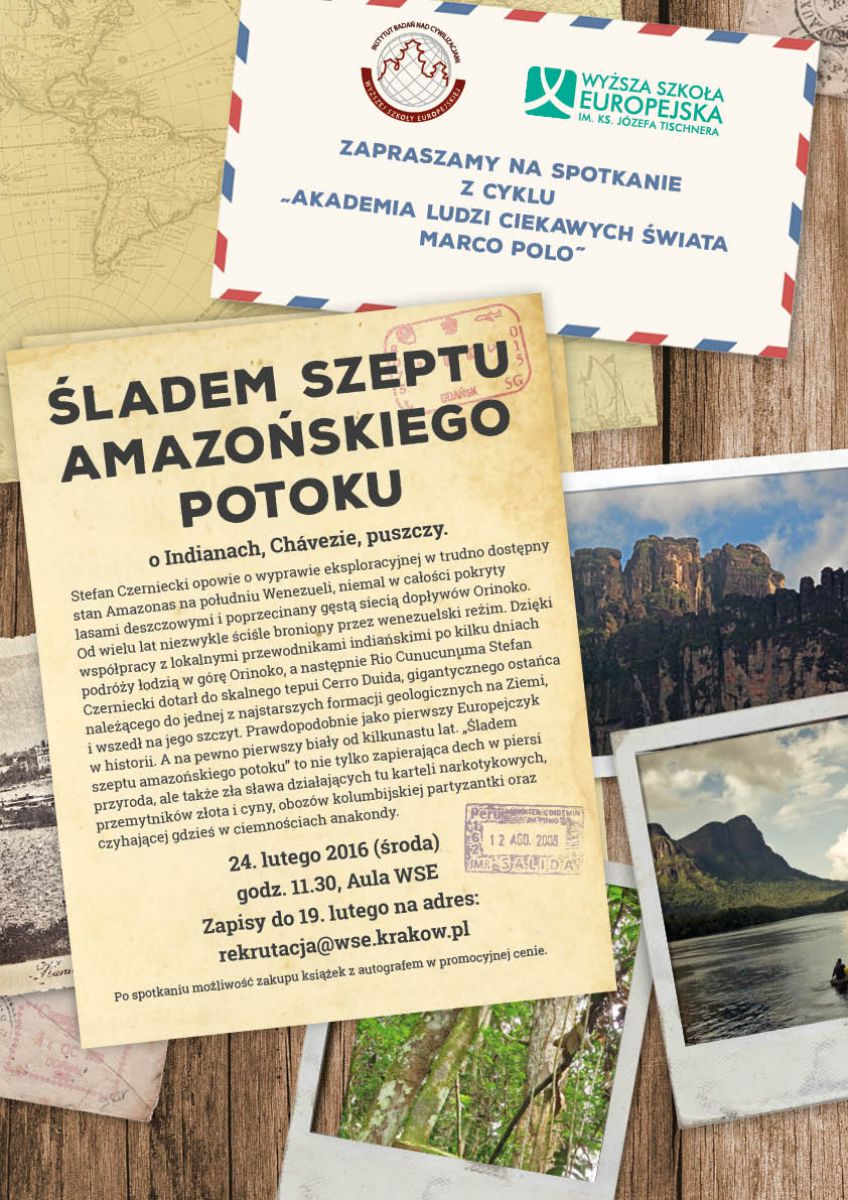 Serdecznie zapraszamy na kolejne spotkanie w ramach "Akademii Ludzi Ciekawych wiata Marco Polo" organizowane przez Instytut Badań nad Cywilizacjami WSE. Naszym gociem będzie Stefan Czerniecki - podróżnik-eksplorator, dziennikarz-fotoreporter, były członek Alpinus Expedition Team, autor ksišżek, twórca programu "Za siódmš górš" w TV Republika. Nasz goć zabierze uczestników w podróż do Ameryki Południowej, a piszšc dokładniej w wyprawę do serca amazońskiej dżungli (szczegóły na plakacie).