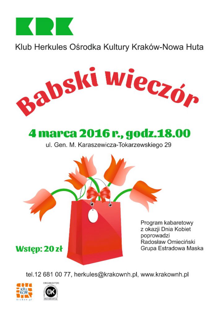 Każda kobieta zasługuje na to, by nosić jš na rękach. Drogie Panie, zapomnijcie na chwilę o codziennych obowišzkach. Zapraszamy Was na wyjštkowe spotkanie z okazji Dnia Kobiet które odbędzie się 4 marca o godz. 18:00 w Klubie Herkules Oœrodka Kultury Kraków-Nowa Huta (ul. Gen. M. Karaszewicza-Tokarzewskiego 29). Wszystkie panie będš mogły spędzić miło czas słuchajšc i bawišc się podczas programu kabaretowego w wykonaniu Radosława Omiecińskiego. Informacje i zapisy w godzinach otwarcia Klubu do 2 marca.