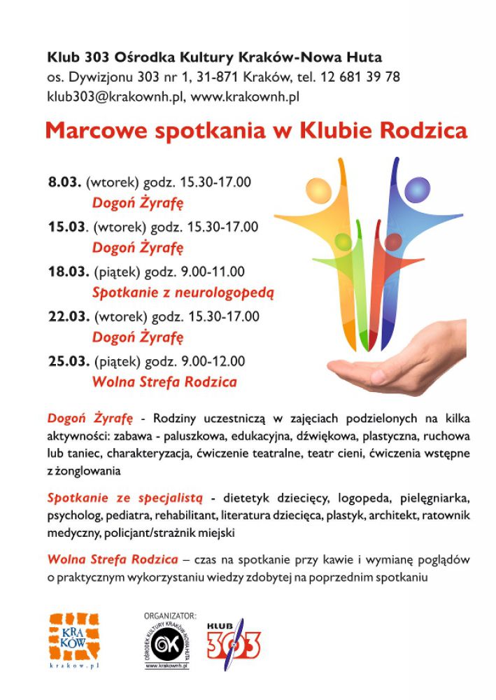 W ramach Klubu Rodzica działajšcego w Klubie 303 Oœrodka Kultury Kraków-Nowa Huta (os. Dywizjonu 303 nr 1) zapraszamy na moduł Dogoń Żyrafę, podczas którego rodziny uczestniczš w zajęciach podzielonych na kilka aktywnoœci: zabawa - paluszkowa, edukacyjna, dŸwiękowa, plastyczna, ruchowa lub taniec, charakteryzacja, ćwiczenie teatralne, teatr cieni, ćwiczenia wstępne z żonglowania.