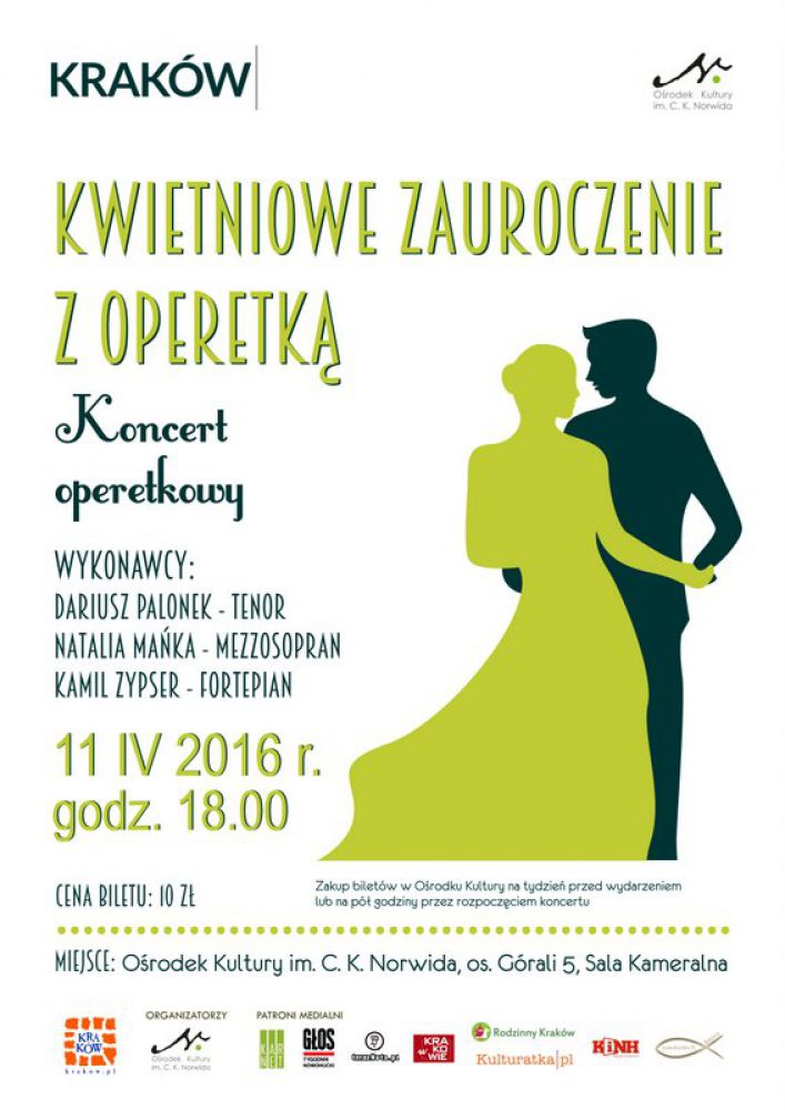 Koncert p.t Kwietniowe zauroczenie z operetkš odbędzie się 11 kwietnia 2016 r., o godz. 18.00 w Sali Kameralnej Orodka Kultury im. C. K. Norwida, os. Górali 5. Bilety w cenie 10 zł będš dostępne przed wydarzeniem w Orodku Kultury. Serdecznie zapraszamy.