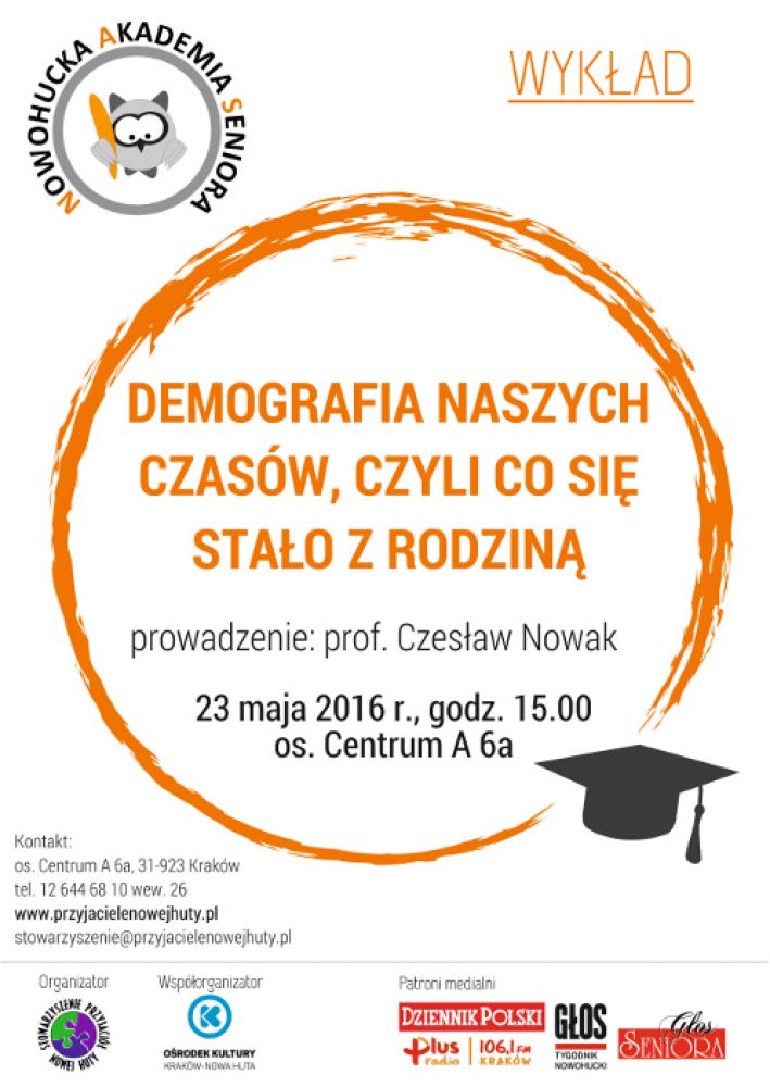 Nowohucka Akademia Seniora (os. Centrum A 6a) zaprasza 23 maja na godz. 15.00 na wykład pt. Co się stało z rodzinš?. Wykład powięcony będzie zagadnieniom dotyczšcym współczesnych zmian demograficznych. Prowadzšcy wykład, prof. Czesław Nowak, opowie o powodach, dla których zmieniajš się modele rodziny i o paradoksach rzšdzšcych wskanikami wzrostu liczby ludnoci. Usłyszeć także będzie można o zmianie stylu życia i zmianach zachodzšcych na rynku żywnoci, które również wywierajš wpływ na współczesne przeobrażenia demograficzne.