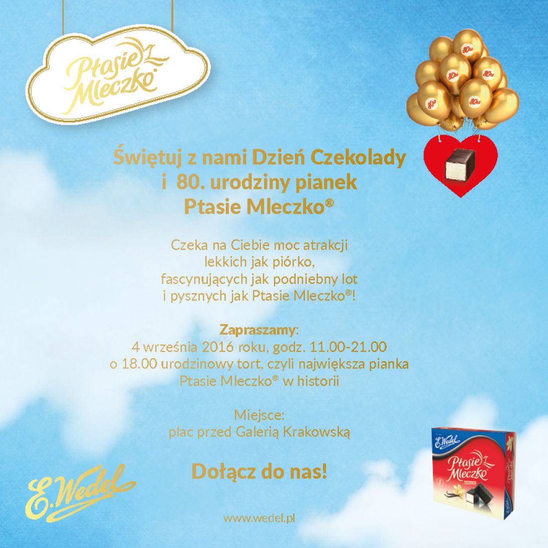 Marka E.Wedel już po raz czwarty więtuje Międzynarodowy Dzień Czekolady, tym razem pod patronatem pianek Ptasie MleczkoŽ, które obchodzš w 2016 roku 80. urodziny. W 2012 roku przy rondzie De Gaulle'a w Warszawie stanęła czekoladowa palma, w 2014 roku na przeciwko Pałacu Kultury i Nauki pojawiła się jego karmelowa replika, w kolejnym za w Warszawie, Poznaniu i Krakowie bohaterami więta były czekoladowe rzeby, symbole miast: warszawska Syrenka, Smok Wawelski oraz poznańskie Koziołki. Wszystkie rzeby zostały przygotowane w Pracowni Rarytasów E.Wedel.