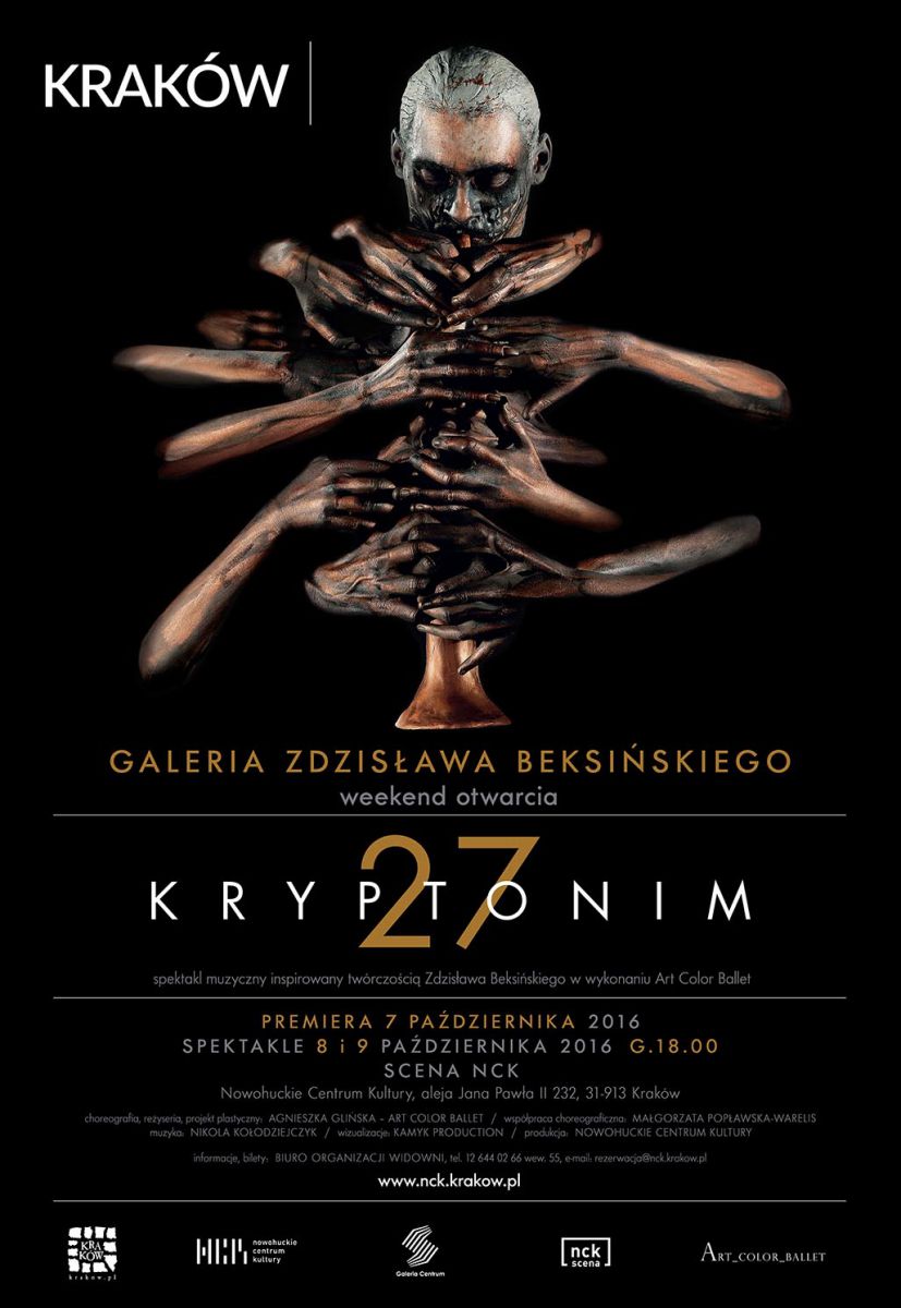 Pierwsza stała wystawa prac Zdzisława Beksińskiego w Krakowie zostanie otwarta już w paŸdzierniku 2016 roku w Nowohuckim Centrum Kultury. Otwarciu Galerii towarzyszyć będzie spektakl KRYPTONIM 27 w wykonaniu Art Color Ballet, który przeniesie niezwykłš wizję œwiata Mistrza Beksińskiego na scenę i w przestrzennym wymiarze spróbuje rozczytać ukryte znaczenia jego dzieł. Widz wniknie w przestrzeń stworzonš z ruchomych obrazów, baletowych ciał, hologramów i żywej muzyki. Między jawš i snem, w galerii i na scenie – w niejasnym planie fantastycznych wizji, nadwrażliwej wyobraŸni i ukrytych lęków…