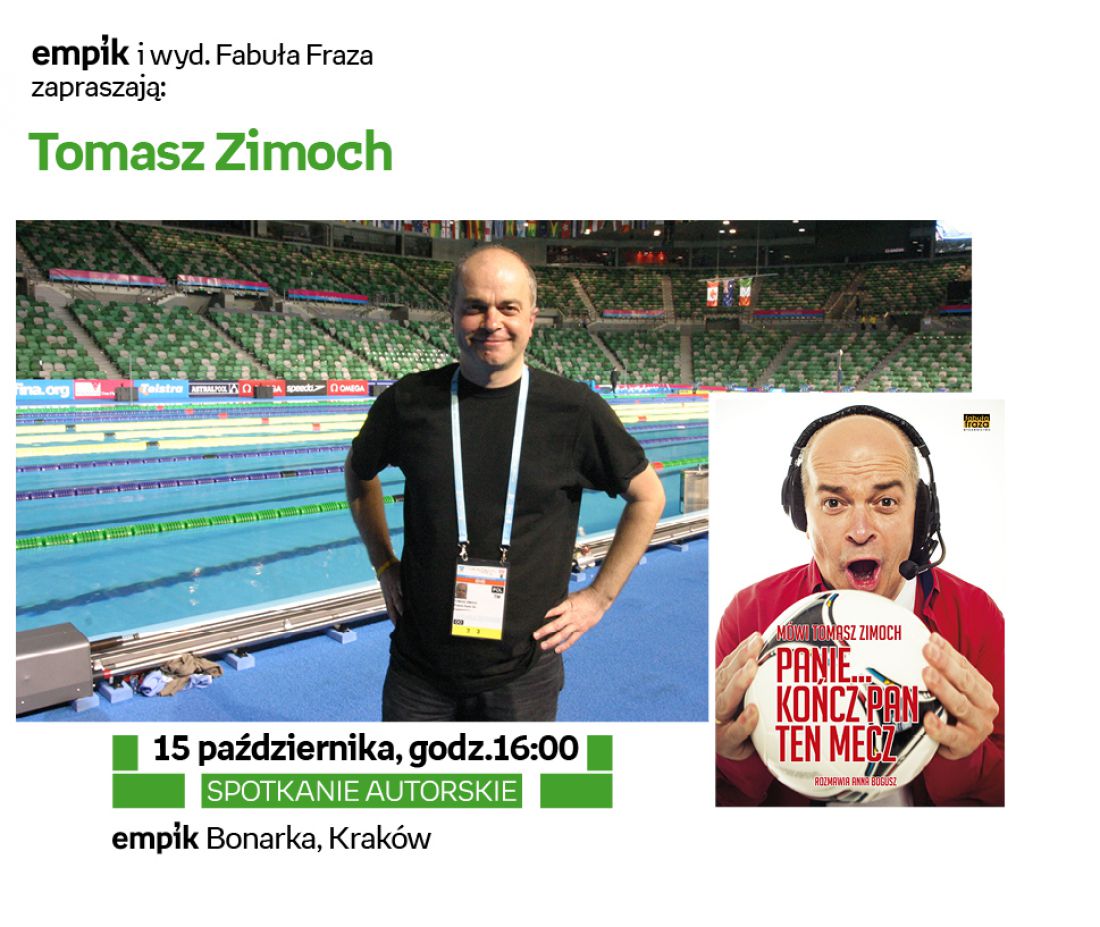 Tomasz Zimoch to legenda polskiego sportu. Nikt tak emocjonalnie jak on nie podchodził do komentowania meczów. W ksišżce Mówi Tomasz Zimoch. Panie... kończ Pan ten mecz (wyd. Fabuła Fraza) opowiada o swojej miłoci do sportu i radia. Tomasza Zimocha będzie można spotkać 15 padziernika w salonie Empik Bonarka.