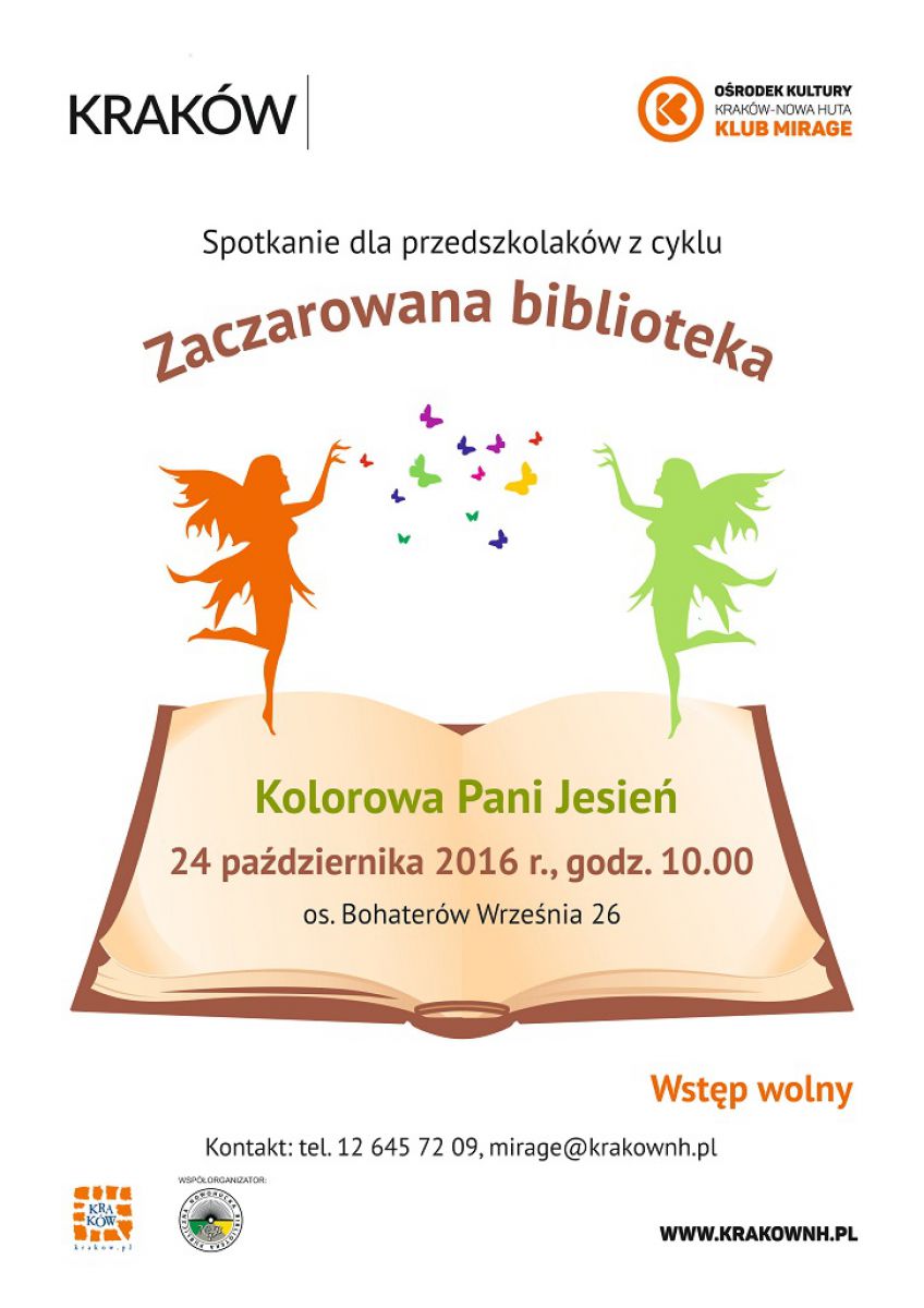 Klub Mirage Orodka Kultury Kraków-Nowa Huta Zaprasza na zajęcia edukacyjne dla maluchów w wieku 2-4 lat w ramach cyklu Zaczarowana biblioteka, które odbędš się 24 padziernika o godz. 10:00. Zajęcia odbywajš się raz w miesišcu w Klubie Mirage na os. Bohaterów Wrzenia 26 i prowadzone sš przez pracowników Nowohuckiej Biblioteki Publicznej. Podczas wizyty do tajemniczego wiata ksišżek dzieci będš miały okazje wysłuchać ciekawych bani, bajek i opowiadań a wraz z ich bohaterami poznawać otaczajšcy ich wiat. Każde spotkanie powięcone jest innemu tematowi. W padzierniku tematem będzie Pani Jesień. Pani Jesień, która jak mówi piosenka kolorowe licie niesie, kosz kasztanów, jarzębinę z tego Pani Jesień słynie. No i jeszcze Pani Jesień wiatr i deszczyk z sobš niesie, ale my się nie boimy i z jesieniš się bawimy. I tak dokładnie jak w piosence będzie na spotkaniu dzieci z Paniš Jesieniš w Klubie Mirage.