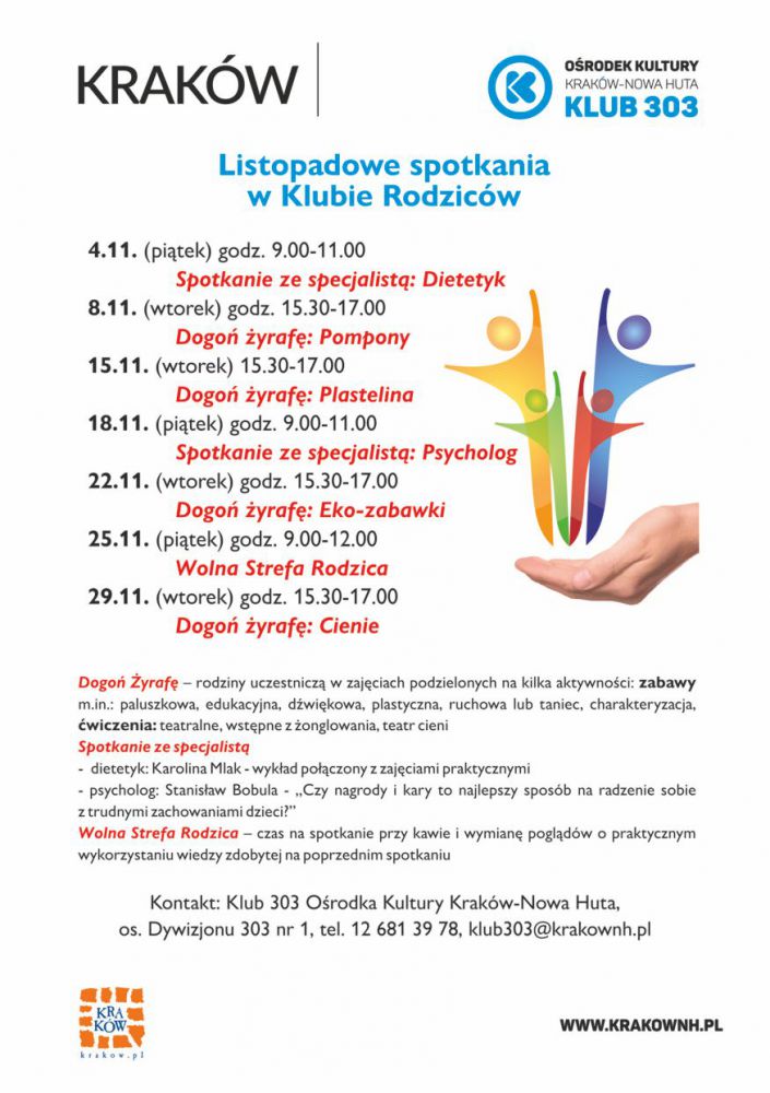 Klub 303 Orodka Kultury Kraków-Nowa Huta (os. Dywizjonu 303 nr 1) zaprasza na kolejne spotkanie Dogoń Żyrafę w ramach Klubu Rodziców we wtorek 8.11. w godz. 15.30-17.00. Z czego można zrobić pompony? Do czego można wykorzystać duży, a do czego mały pompon? Czy pompon wysoko skacze? Czy pompon może być tylko przy czapce? Czy pomponem można kogo połaskotać? Na te pytania uczestnicy spotkania będš szukać odpowiedzi podczas zajęć w Klubie Rodziców. Oczywicie nie zabraknie paluszkowych wierszyków, rymowanek i pomponowych masażyków.
