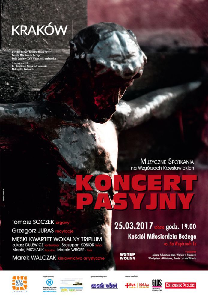 Najbliższy koncert w ramach cyklu Muzyczne Spotkania na Wzgórzach Krzesławickich to muzyczna opowieć o męce i pasji Jezusa Chrystusa. Odbędzie się on 25 marca br. o godz. 19.00 w kociele pw. Miłosierdzia Bożego (os. Na Wzgórzach 1a). Na koncert zapraszajš organizatorzy cyklu: Orodek Kultury Kraków-Nowa Huta, Dzielnica XVII Wzgórza Krzesławickie oraz Parafia Miłosierdzia Bożego na Wzgórzach Krzesławickich.