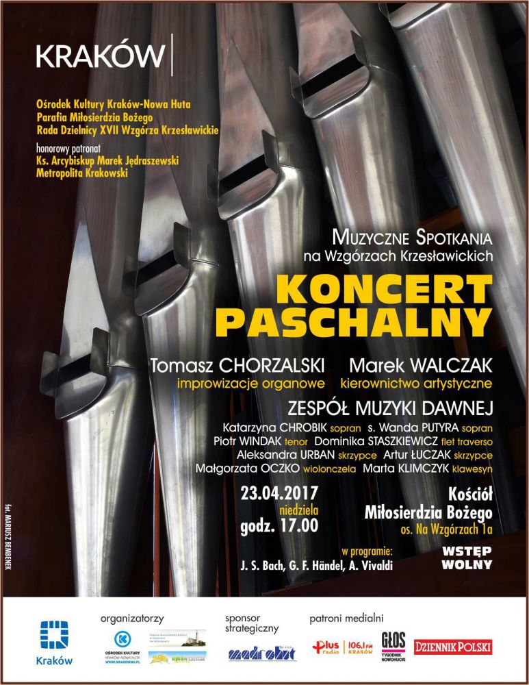 Na koncert zapraszajš: Oœrodek Kultury Kraków-Nowa Huta, Dzielnica XVII Wzgórza Krzesławickie oraz Parafia Miłosierdzia Bożego na Wzgórzach Krzesławickich. Kierownictwo artystyczne nad wydarzeniami cyklu sprawuje Marek Walczak organista parafii Miłosierdzia Bożego na Wzgórzach Krzesławickich.