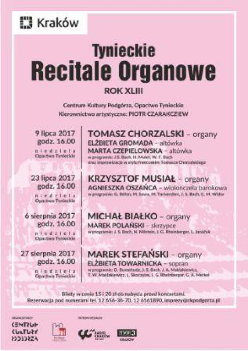 Centrum Kultury Podgórza oraz Opactwo Tynieckie zapraszajš na Tynieckie Recitale Organowe. To niepowtarzalna okazja na zapoznanie się z klasykš organowš szkoły niemieckiej i francuskiej, a także z muzykš włoskš nie tylko na ten majestatyczny instrument.